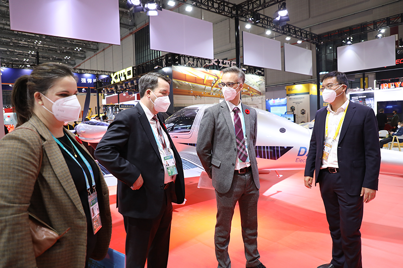 11月6日,加拿大駐上??傤I(lǐng)事Dave Murphy和副總領(lǐng)事Alexandre Cerat一行到訪(fǎng)進(jìn)博會(huì )萬(wàn)豐鉆石飛機展臺參觀(guān),萬(wàn)豐航空團隊陪同參觀(guān)。